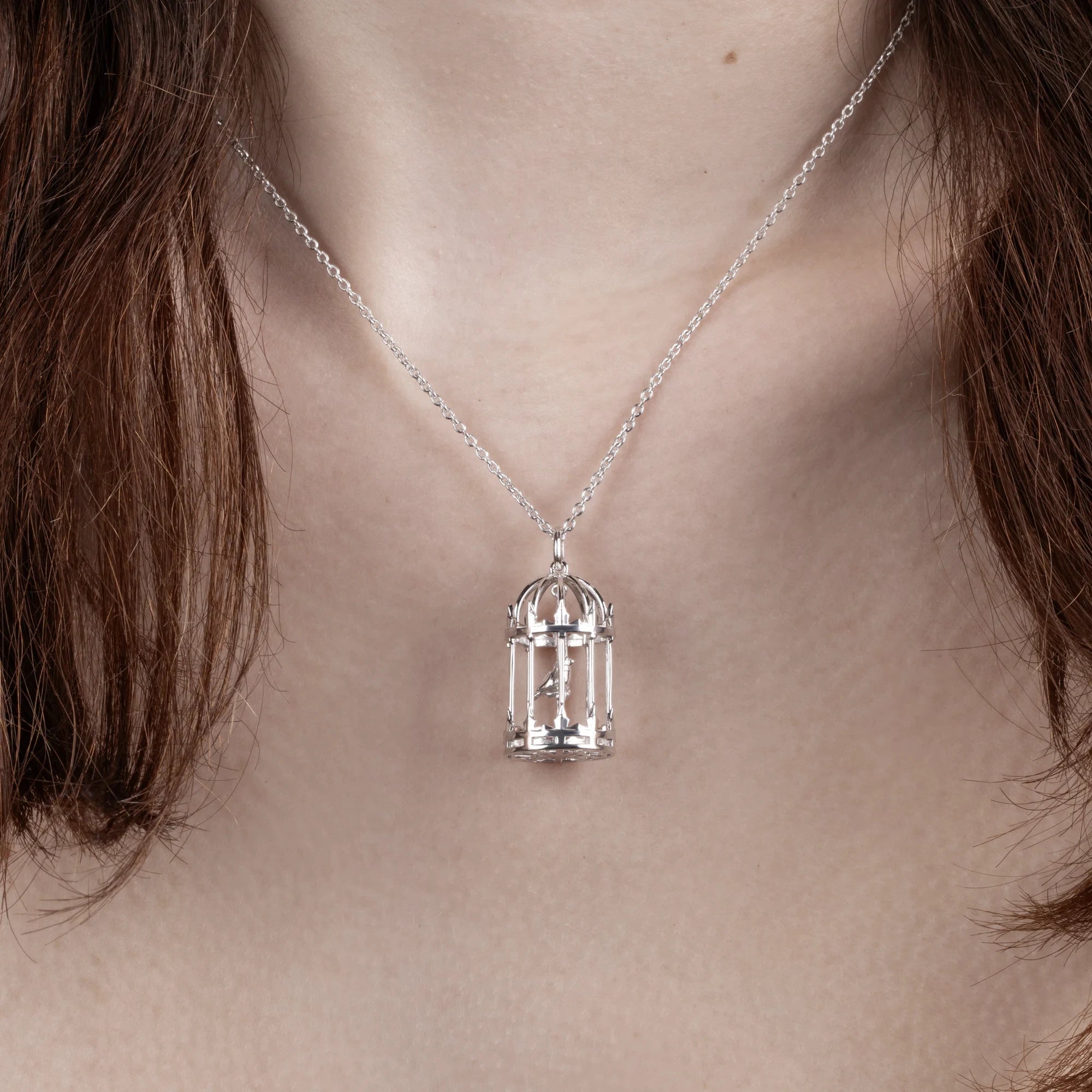 Let your soul take flight with our Finch Birdcage Pendant. Perched inside her cage, this songbird melodiously swings back and forth, plotting her escape. Victorian-crowned and delicately fleeting, this pendant's regal beauty is eternally captivating.